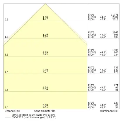 Le code couleur se compose de l'indice de rendu des couleurs (IRC) et de la température de couleur (Kelvin). Le premier chiffre indique le rendu des couleurs (1 = très mauvais rendu des couleurs, 9 = meilleure authenticité des couleurs). Le deuxième et troisième chiffre indiquent la température de la couleur. Exemple : Le code couleur "830" indique que la lampe a un bon rendu des couleurs (8) et une couleur de lumière blanche chaude (30 = 3000K). |