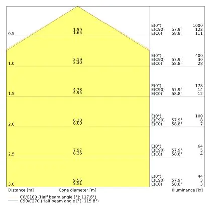 Le code couleur se compose de l'indice de rendu des couleurs (IRC) et de la température de couleur (Kelvin). Le premier chiffre indique le rendu des couleurs (1 = très mauvais rendu des couleurs, 9 = meilleure authenticité des couleurs). Le deuxième et troisième chiffre indiquent la température de la couleur. Exemple : Le code couleur "830" indique que la lampe a un bon rendu des couleurs (8) et une couleur de lumière blanche chaude (30 = 3000K). |