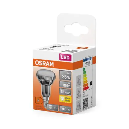 La lampe LED Osram LED Star Spot LED E14 R39 2W 110lm 36D - 827 | Remplacement 25W avec culot E14 (Ampoule à vis petit culot) est le remplacement idéal des lampes à incandescence et halogènes classiques. En raison de la faible consommation d'énergie, vous économisez considérablement sur vos coûts d'énergie. Les lampes à LED Osram n’utilisent qu’une petite partie de la puissance (2 W) que les lampes à incandescence et halogènes classiques (25 W). Les lampes à LED ont une excellente classe énergétique F, ce qui signifie qu'elles sont très écologiques et peuvent être recyclées après utilisation. En raison de leur durée de vie considérable de 15000 heures, vous n’aurez pas à les changer de si tôt.